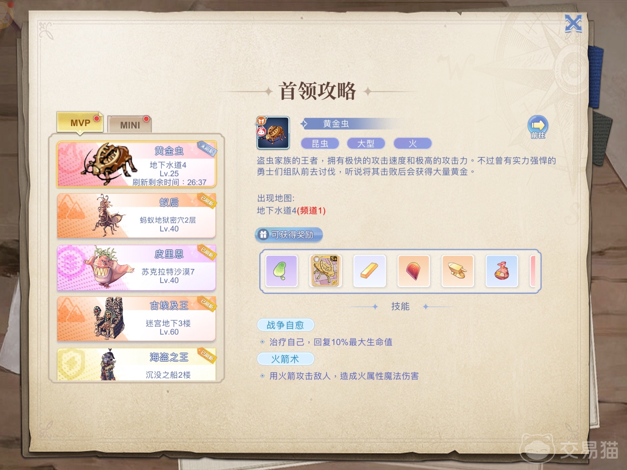 玩家可以直接点开首领攻略,在MVP一栏的第一行查看黄金虫的刷新情况。若是黄金虫的标签为已刷新,玩家可直接传送过去寻找,反之,上面还会显示距离黄金虫下一次刷新还有多久,玩家可根据倒计时所剩的时间,来合理安排时间前往,争取在它刷新前到达指定地图。