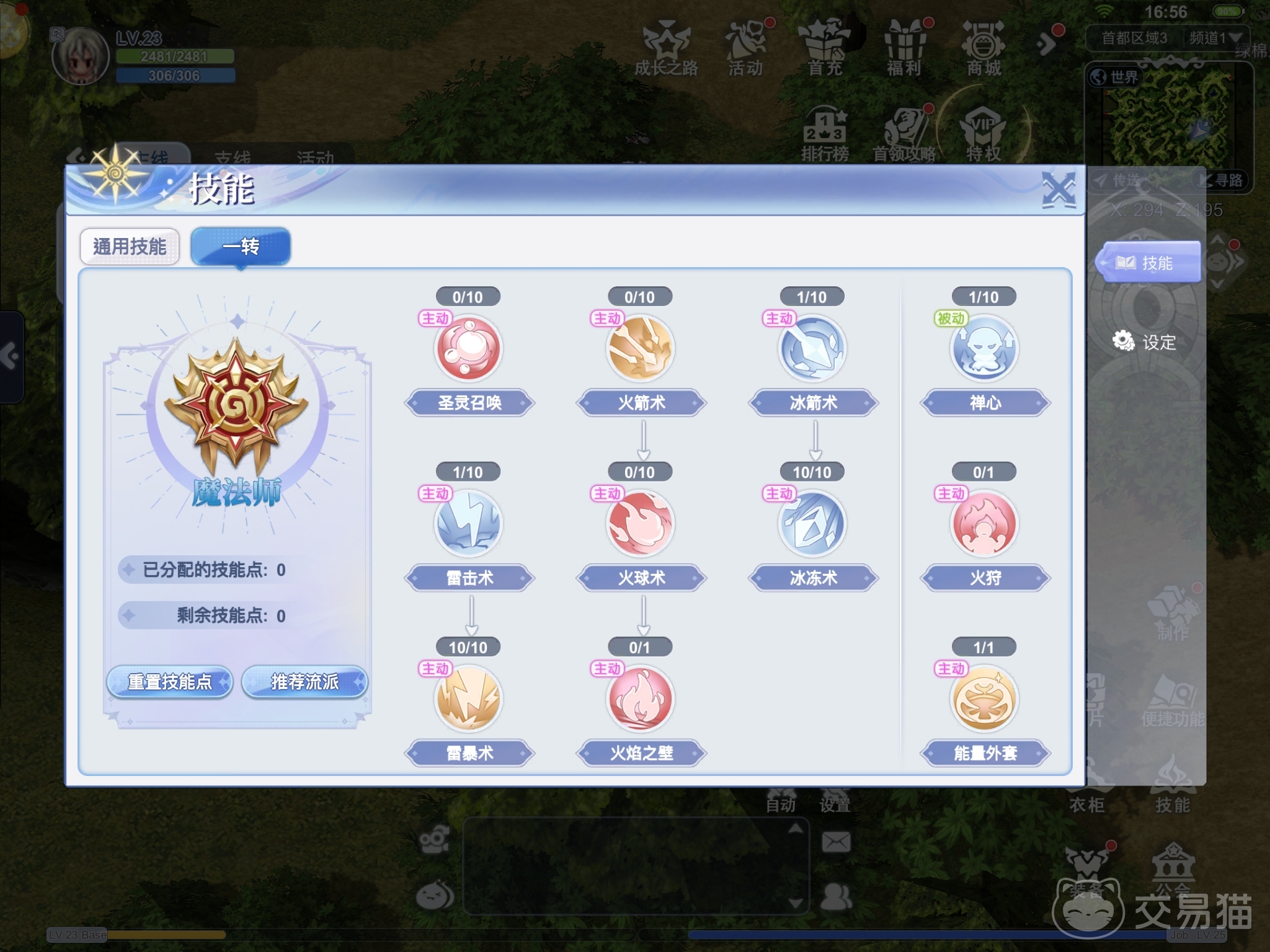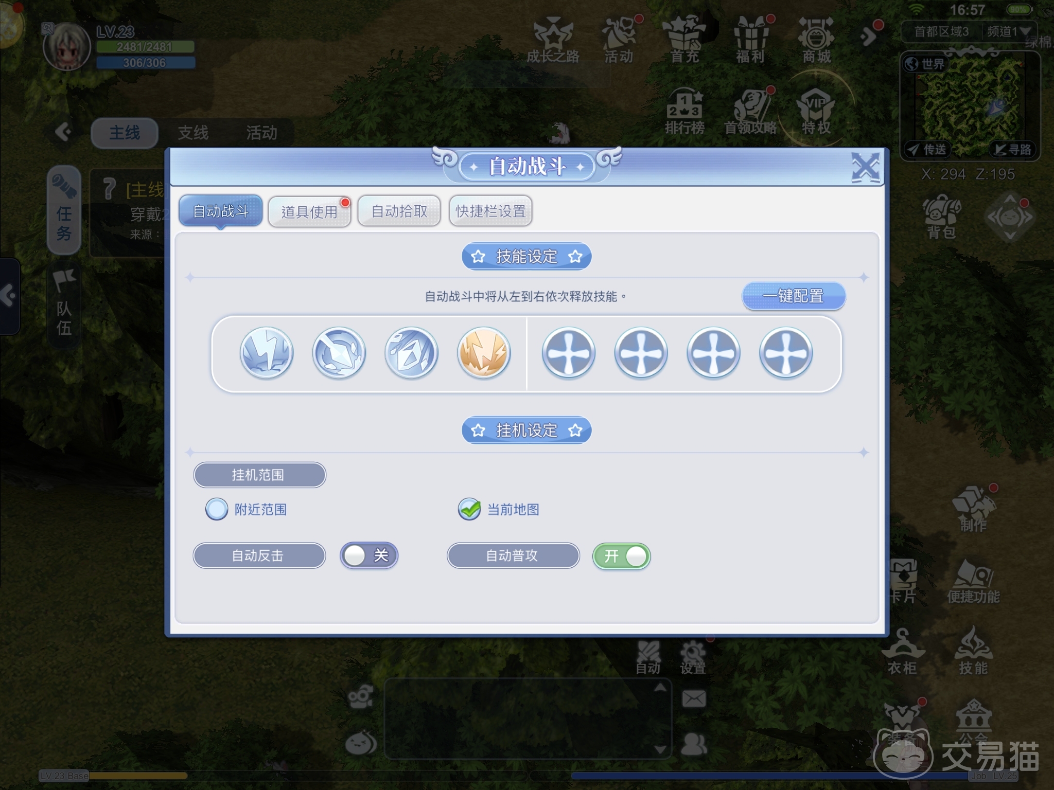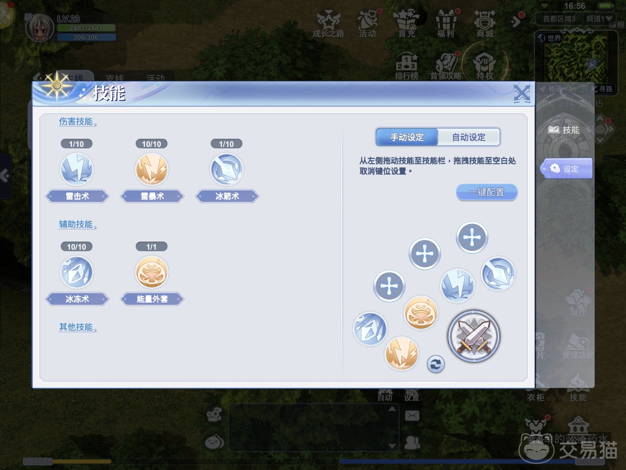 加点后的技能需要放入快捷栏中才能使用,因而玩家需要在技能界面一栏里进行设置,不想麻烦的玩家可选择一键配置,让游戏自动把技能分配好。但小编更建议玩家手动设置,例如在前期时就放一个CD短的主力输出技能和一个保命技能(或buff技能),从而节约练级时的蓝耗,避免自己需要频繁地进入商城补充蓝药。
