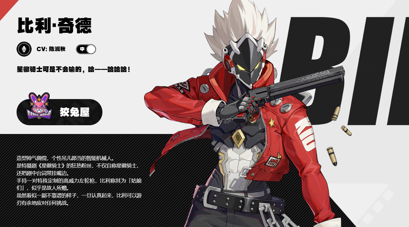 第二个角色叫做【比利奇德】。比利奇德是隶属于狡兔窟的一名非常特别的人物。他看上去是一名不正经的红发机械人,但是当他举起来那一堆经过特殊定制的左轮枪的时候,就要知道比利奇德要开始发力了。比利奇德在游戏中拥有独特的穿透伤害,他的弹药能够对敌人们发出搞得伤害,并进行连环穿透,是游戏中独一无二的特殊机制,非常不错。