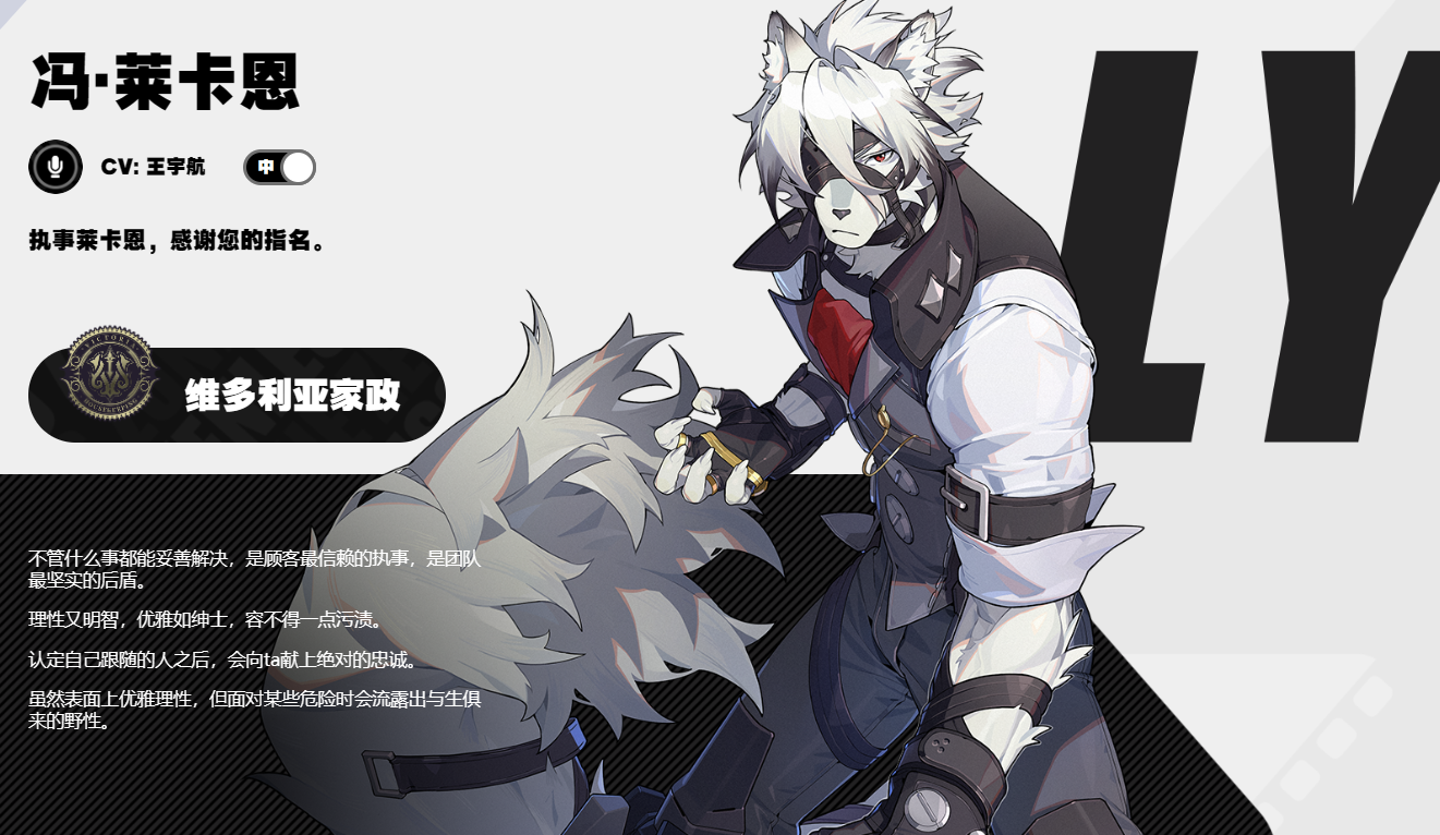 第六个角色叫做【莱卡恩】。莱卡恩和可琳一样,都隶属于维多利亚家政。不同于女仆,莱卡恩的职业是执事。莱卡恩的职业素养也是非常高的,在《绝区零》的世界当中,无论是什么事,只要交给莱卡恩,那么问题就会迎难而解。莱卡恩就是顾客们最信赖也最为尊敬的执事。而在战斗中,莱卡恩会展现出他作为狼人的凶猛和残暴。在战斗当中,莱卡恩会毫不留情地挥舞他的利爪,击败每一个敌人。