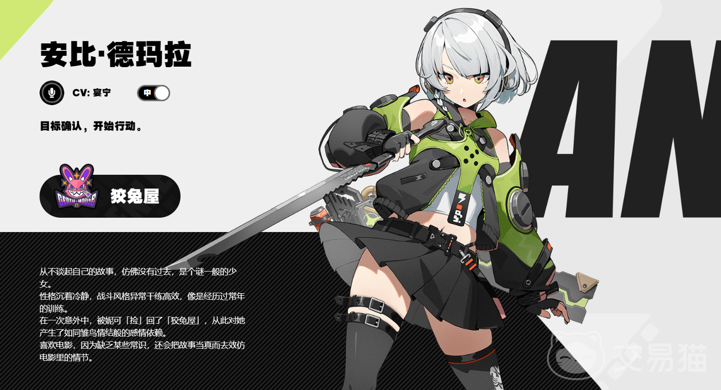 第一个角色的名字叫做【安比】,安比也是《绝区零》app的图标人物。在游戏当中,安比是一个没有过去的谜一样的女孩,她的个性非常沉着和冷静,在战斗中,她的动作永远是干练的。安比作为游戏中第一个电属性的输出角色,她的技能就像闪电一样飞快。