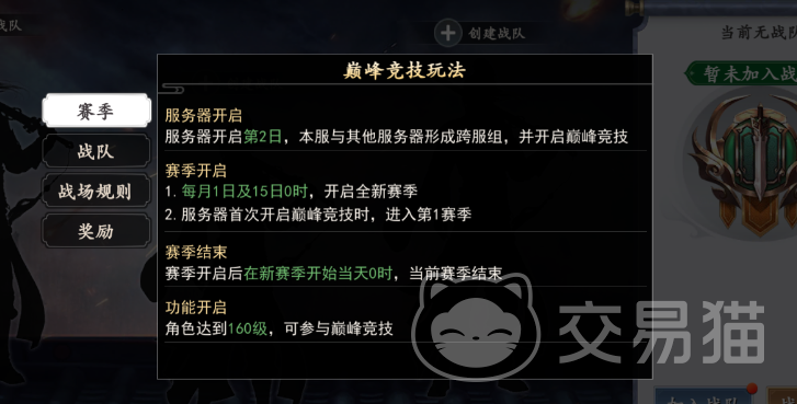 第二个就是巅峰竞技玩法,这是就需要大家去创建队伍来进行比赛了,这个比赛大家可以选择创建或者加入战斗,可以选择跨服组队!而且这个属于赛季制度的,大家可以根据选择来进行操作!不过体验这个模式也是有要求的,是需要大家等级达到160级的时候,才会开启的!