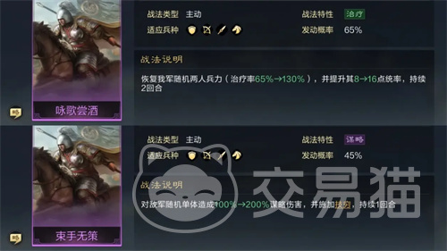 白虎阵型:以攻击为主,擅长爆发输出,打出高额的主动技能伤害。白虎阵型的代表武将有曹操、孙策、吕布等。白虎阵型的优点是能够在短时间内对敌人造成巨大的伤害,而且还能够通过一些战法增加自己的主动技能发动率或效果,如威名显赫、如有神助、克敌如风等。白虎阵型的缺点是防御较低,容易被敌人的谋略伤害打垮,而且对自己的主动技能有一定的依赖,如果被干扰或削弱,就会大大降低输出效果。