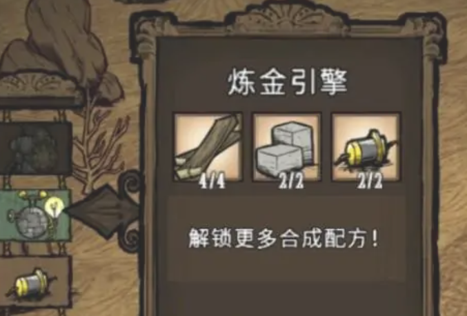 然后需要建造一个炼金引擎,这是一种高级的科技设备,可以解锁更多的合成配方,其中就包含我们需要的矿工帽了。而炼金引擎需要用到木板*4,石方*2,炼金零件*2,这些材料都可以用木头,石头,金子制作,而零件的话也能在墓地挖或者打机械怪掉落。炼金引擎就是我们俗称的二本,有了二本就够制作矿工帽了。