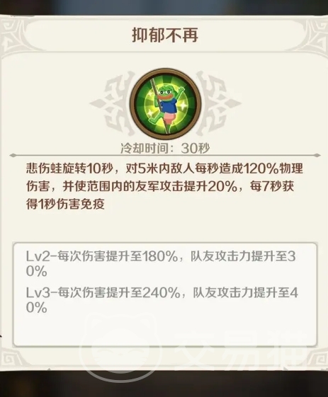 三技能是“抑郁不再”,效果是旋转十秒并对附近敌人每秒造成一定伤害,同时令范围内的友军获得20%的攻击提升,并且还会给予他们每七秒一次免疫伤害的加强,这招同时增幅了攻防,由此可见悲伤蛙对于队伍的提升非常全面。