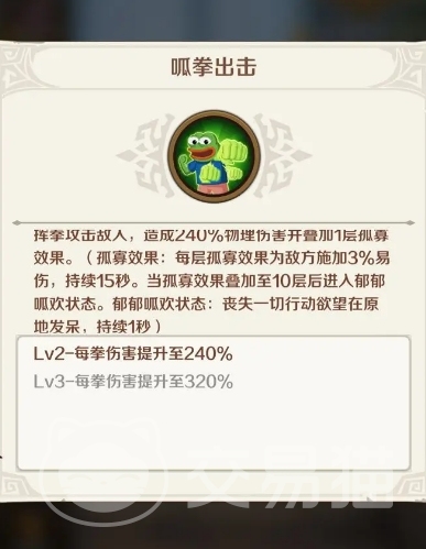 二技能是“呱拳出击”,效果是挥拳攻击敌人造成一定物理伤害并叠加一层孤寡,孤寡效果可以让敌人被附加持续15秒的3%易伤,同时叠加到十层后还能让敌人陷入郁郁呱欢,从而在原地发呆一秒。