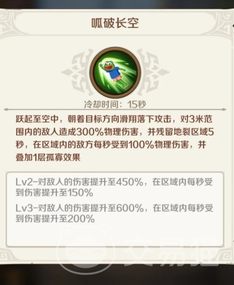 悲伤蛙的属性主要以攻击见长,它的破甲属性也十分不错,非常适合担任队伍的输出主力,技能方面,一技能是“呱破长空”,效果是跳到空中朝目标方向进行下落攻击,落地后会造成三倍攻击的AOE物理伤害,并且落地区域的敌人在之后五秒内会持续受到额外物理伤害,同时还能叠加一层孤寡效果。