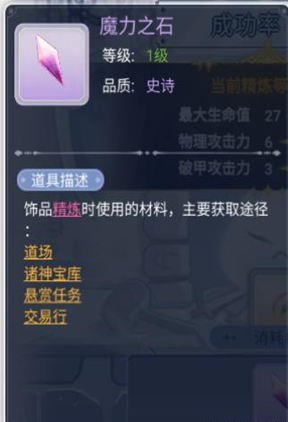 魔力之石属于紫色史诗级品质,是初级套装里的饰品升级材料。