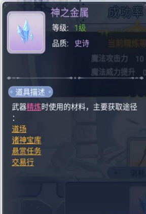 神之金属属于紫色史诗级品质,是初级套装里的武器升级材料。