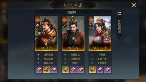 吴国的追击队是以孙策为核心,搭配甘宁和孙权,形成一个以水军为主的追击队。这个阵容的优势是,孙策、甘宁和孙权都有自带的追击战法,而且孙权还可以提供水军的缘分加成,增加全体的攻击力和防御力。这个阵容的战法携带如下: