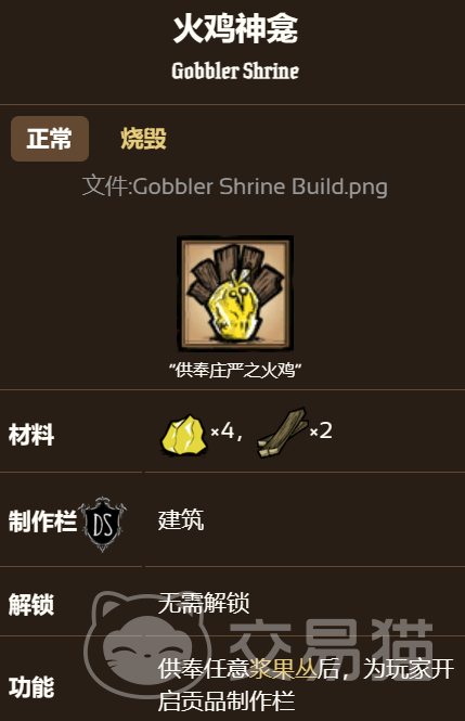 这个活动需要先找到一个浆果丛,并用铲子将其挖出来。浆果丛是火鸡的最爱,你只需要一个浆果丛就可以了。然后需要在物品制作栏里的建筑选项中,制作一个火鸡神龛。火鸡神龛的材料是8个金子和2块木板,不需要科学机器来解锁。可以把火鸡神龛放在一个有很多浆果丛的地方,这样可以吸引更多的火鸡。
