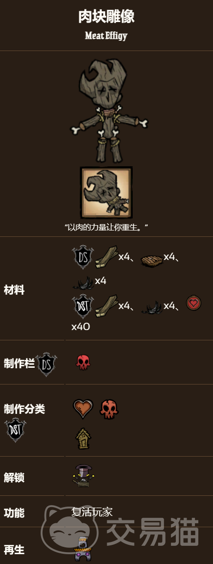 复活台除了在地图上偶遇之外,其实是能够自制的。复活台也就是肉块雕塑属于魔法类建筑,需要在灵子制造台旁边才能制作。复活台的材料有四种,分别是:4个活木,4个烤肉,4个胡子。如果在新家园沙盒玩法中,若没有偶遇自然状态下的复活台,尽量要赶在冬季之前制作好复活台。活木可以通过砍伐活树或者使用活木剑杀死活树怪获得。烤肉这里就不多说了,但要注意区分一下正常肉和怪物肉,怪物肉是做不出肉块雕像的。胡子的话可以去打一下黑兔子、穴居猴、或者黑兔子风滚草拼脸,黑兔子可以直接用暗影陷阱转换普通兔子或者直接抓。