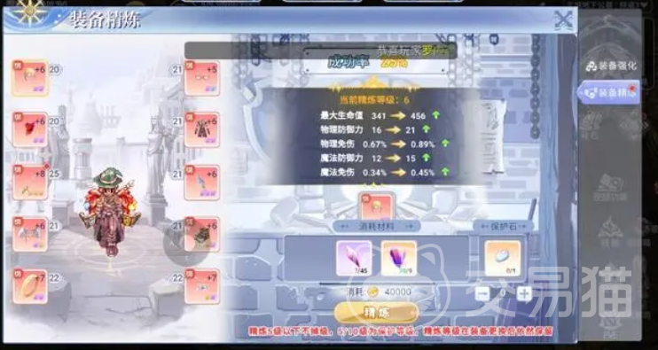 在本系统中,装备精炼是必不可少的游戏里有10个道具可以分成四个类别,分别是饰品,主手,副武器,防御。不同的武器,需要不同的精炼原料。玩家应该知道,在锻造武器的时候,有一定的风险。在+5以前,提炼不成功会造成原料流失。如果没有加强的护身符,那么在+6以上的时候,你的武器将会被削弱到+5。一旦有了这个护身符,就算没有成功,所造成的伤害也会减少到最小。