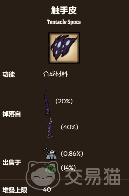 拿到触手皮就能拿来制作物品了,三尾猫的教诲:需要 1个触手皮,2 个猫尾巴。这是一种“远程近战武器”......因为它有个被动是增加3点攻击距离,但本身的设定是近战武器,伤害27.2,耐久奇高172非常实用。羽毛帽:需要 2 个触手皮,2 个红羽毛,3 个黑羽毛。这是一种吸引鸟类的帽子,可以在任何季节穿戴,每分钟恢复 2 点理智,还可以让附近的鸟类着陆在地上,方便捕捉或杀死。雨衣:需要 2 个触手皮,2 个电子元件,2 个蜂蜜。这是一种防雨的外套,可以在雨季穿戴,可以完全防止湿润度的增加,还可以抵御 60% 的冰冷和 70% 的热度。