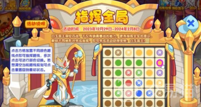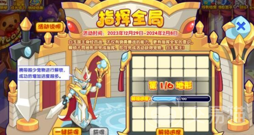 白玉国王是玉魔棋系列的国王,拥有强大的攻击和防御能力,以及独特的技能和血脉。白玉国王是一只限时活动宠物,只有在特定的活动期间,才有机会获得。这个活动叫做“玉魔棋之战”,是一个以象棋为主题的解谜和对战的活动。这个活动里面只能携带尽量少的宠物,挑战不同的玉魔棋宠物,战胜它们就可以获得地形解锁的进度。当全部地形解锁后,就会开启本活动的难中之难:玩家需要通过同色的路线,连接两个相同的颜色点,限制条件是不能其他的相交。如果玩家能够成功完成这个挑战,就可以获得白玉国王的的英雄碎片,集齐一定数量的国王英雄碎片,就可以兑换白玉国王了。