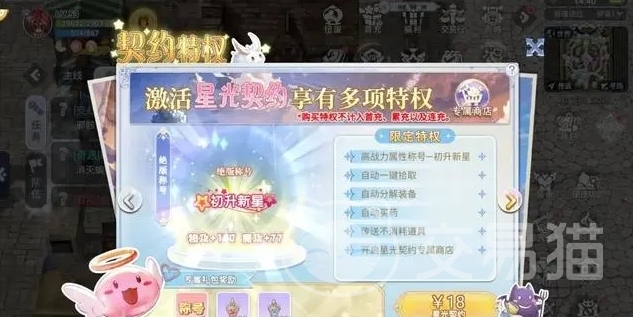 在游戏中契约也是分为了许多中,首先就是星光契约,这个在开通以后玩家就能获得自动拾取的功能,期间可去分解各类装备,包括自动买药和提升自身的战力属性等,像绝版称号“初升新星”也是通过它来获取的。