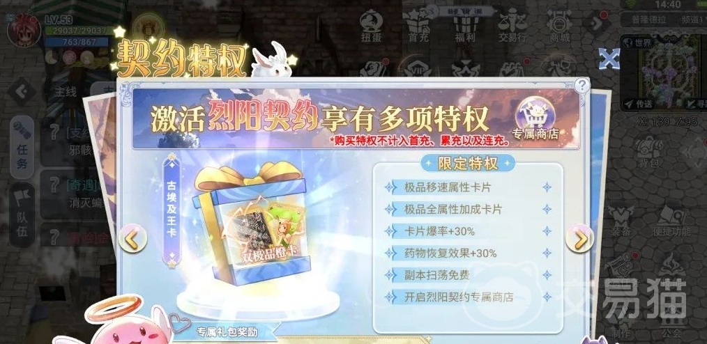 然后就是烈阳契约了,值得大家注意的是它有赠送极品移速卡片和全属性的加成卡片,同时在战斗的时候卡片的爆率额外增加百分之30,副本免费扫荡也会给到大家。