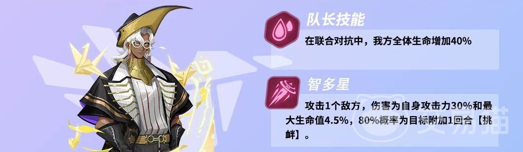 第1个技能智多星,攻击一个敌方单位,根据自身攻击力和最大生命值比例计算伤害,有高几率为目标附加一回合挑衅状态。对方被挑衅之后会强制进行攻击,起到限制输出的目的。第2个技能足智多谋,选择一个敌方目标攻击两次,同样是按照自身攻击力和最大生命值计算伤害,有50%几率添加挑衅,这一次将持续两个回合,同时自身获得两个回合的护盾效果。护盾量按照自身最大生命值的25%添加,该技能还有一个特点是不会失手,一定会命中,所以对敌方起到硬性控制的作用,因为自身有了护盾,即使挑衅之后也不会受到太多的伤害。