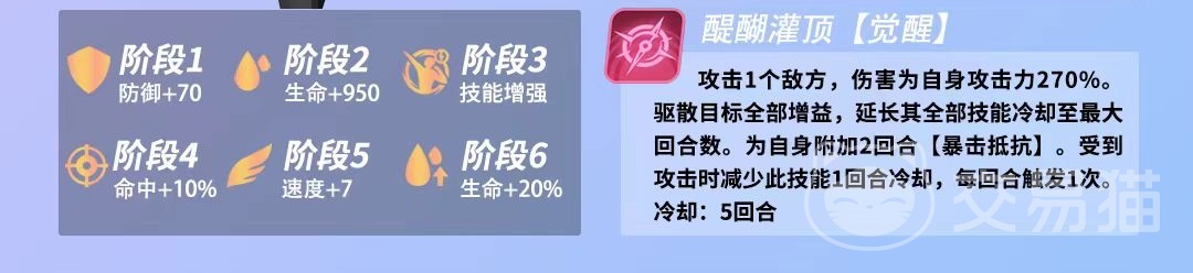 在觉醒之后获得技能醍醐灌顶,攻击敌方目标,按照自身攻击力270%计算伤害,将目标身上所有增益效果全部驱散。并将其全部技能冷却时间延长至最大回合数,自身获得两回合暴击抵抗效果。每次受到攻击都可以减少此技能,一回合冷却时间,每回合只能触发一次。不仅伤害出色,而且将对方身上的状态全部清零,最重要的是延长冷却时间,使其无法放出关键性技能。