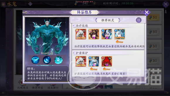 第三个是水鬼,这个boss能够释放高额的aoe伤害,同时还能永久的冰冻半血以下的妖灵,那么大家最好还是去选择治疗妖灵来出阵比较的好。
