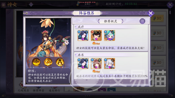 第二个boss神女,她能够不断恢复自身生命,大家需要选择妖灵给神女去上减疗的buff,同时冰冻的效果也是不错的,能帮大家快速的击败她。