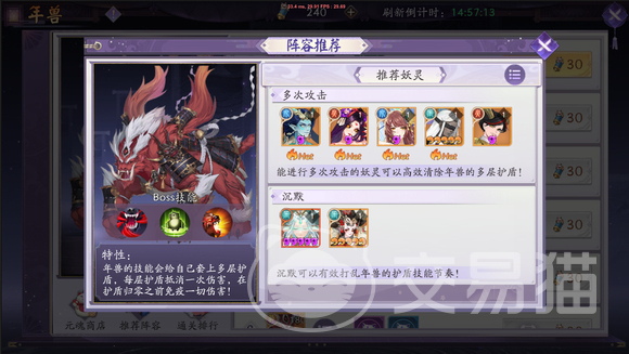 第一个boss是个年兽,它还会给自己上护盾,而玩家需要通过多次的攻击来快速的打掉这个护盾,以此来对年兽造成伤害吗,因此建议优先选择能多次攻击的妖灵。