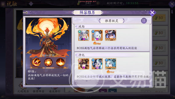 最后就是祝融了,能够直接秒杀己方的全员,所以大家带上减伤和减怒气的妖灵就能尽可能延缓boss的技能释放。