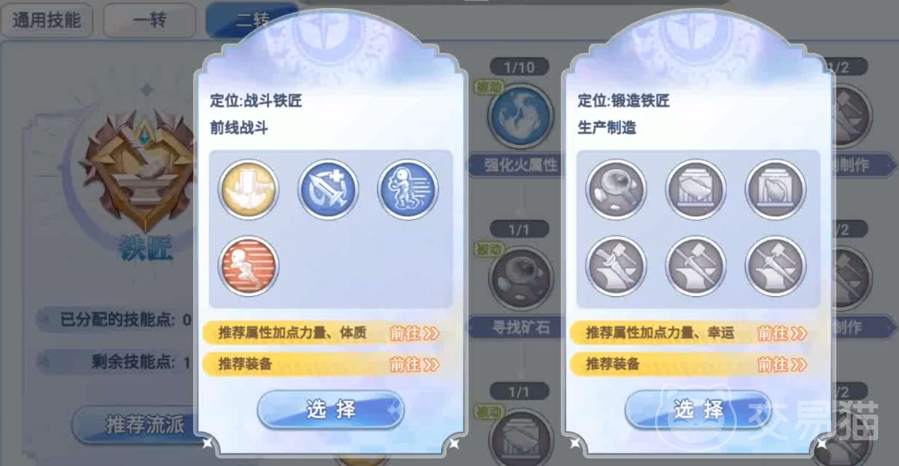 建造系的铁匠技能选择很多,因为技能点有限,不能全部都分配,玩家可以根据自己想要建造的目标物来点技能。推荐技能加点:寻找矿石,有几率在野外杀怪获取不同属性的稀有矿石。金属熔炼,可以处理大部分矿石原石,并在工艺手册制作成相应的加工金属。属性石熔炼,对四种属性的矿物进行提炼,制作成属性原石,想交易材料就选这个。剩下技能可以按需求点双手剑、短剑、拳套制作等。