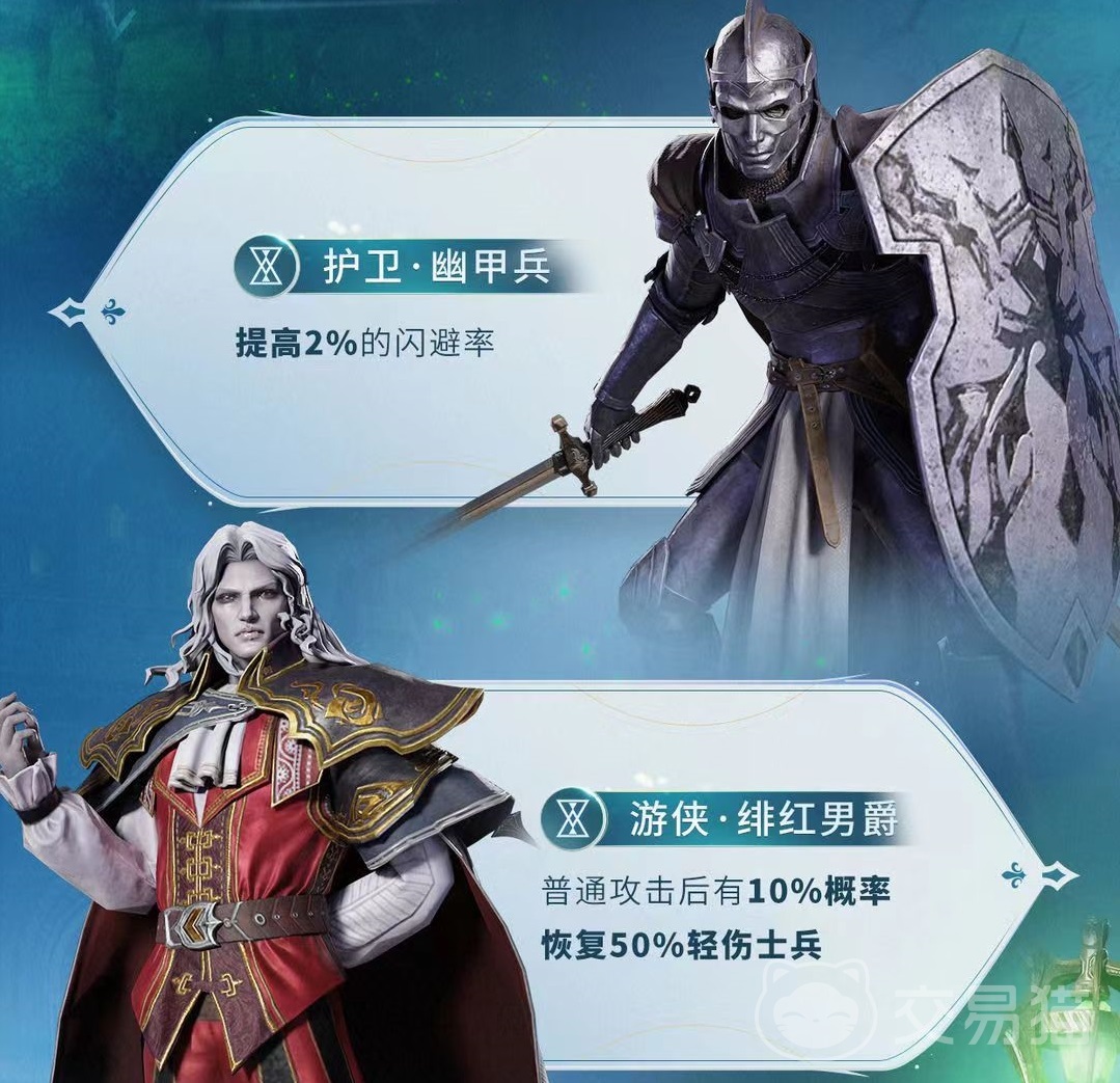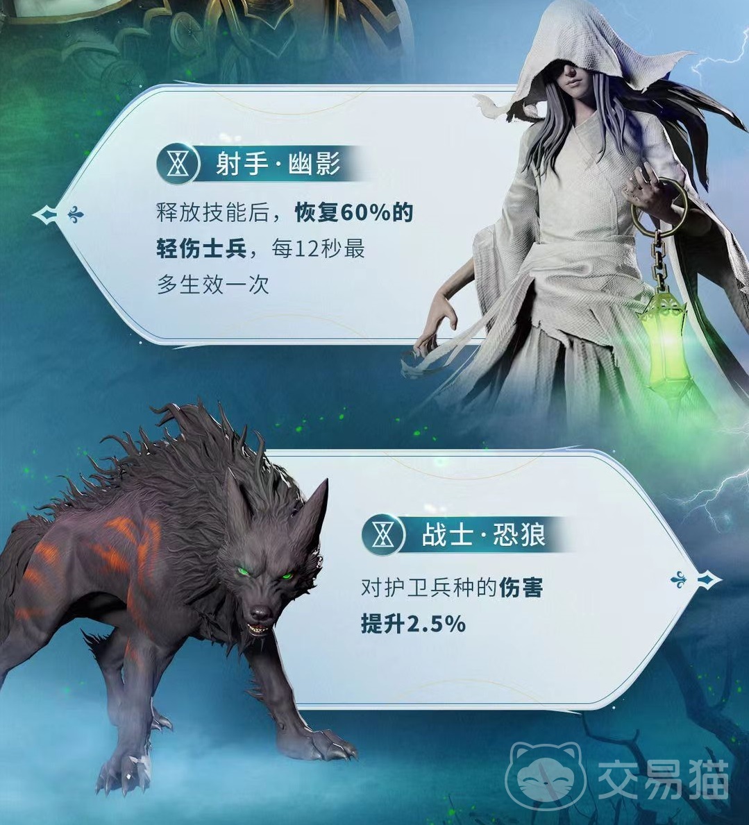 法师影法能提高5%技能伤害,骑兵黑暗骑士在普通攻击后有20%概率增加部队4%暴击率,每一次触发持续三秒钟,虽然增多的数值看似不高,但覆盖整个部队还是有很强的伤害加成。射手幽影属于远程输出类型,在释放技能后恢复60%的轻伤士兵每12秒最多生效一次。相比于游侠,射手所带来的恢复效果更好,但存在冷却cd限制。