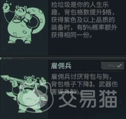 再比如说雇佣兵,这个也是近段时间玩家们用的比较多的。这个原型的能力是武器的伤害提高8%,但是玩家本身的背包会下降3格,这个是永久下降的。可以说是牺牲背包的容量来获取攻击力的提升,对于喜欢战斗的玩家来说还是挺划算的。