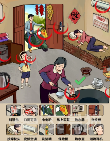 通关物品:料理包【宫保鸡丁】,口渴可乐,小电驴,线上买菜,热水器,指纹锁,按摩枕头,变频空调,洗洁精,保险柜,热水壶,潮流耳机;
