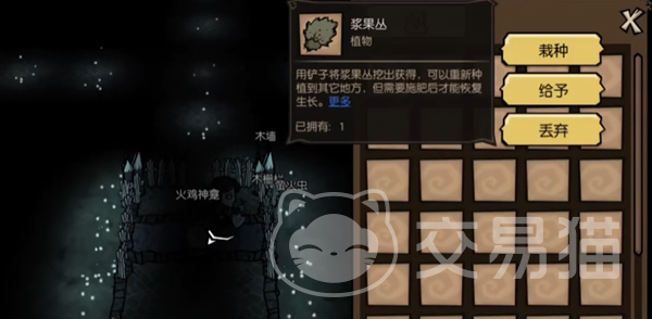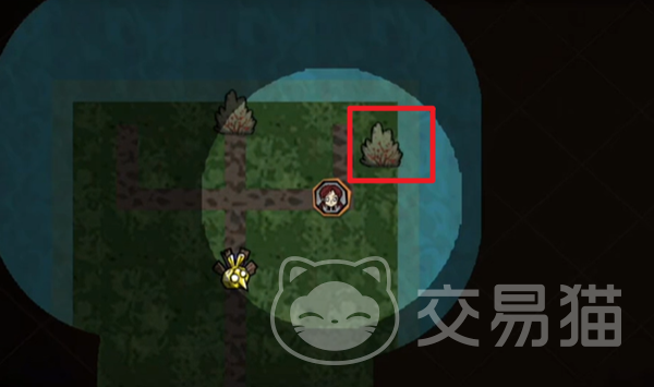 不用着急,去右侧的岔路尽头,放下第二个荧光果,就能看到一把铲子。将铲子拾取之后打开地图可以看到右侧隐藏在黑暗处的浆果丛。我们直接用铲子将这个浆果丛铲起来,不要拾取,快速回到中间上面岔路的浆果丛那里。因为第一个浆果丛是黑暗中的,铲起来容易影响san值,不安全。