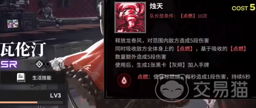 她的一技能叫做烛天,触发条件需要点燃效果产生十次才能释放。可以释放龙卷风,对范围内敌方造成多段伤害,并吸收所有敌人的点燃效果,基于吸收能量造成额外伤害。另外还能对敌人施加灼烧状态,是个范围性技能。