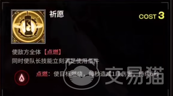 二技能的话叫做祈愿,使用之后可以直接使所有的敌人燃烧,并可立刻使用一技能。算是个辅助技能,每秒都能对敌人造成一次伤害。
