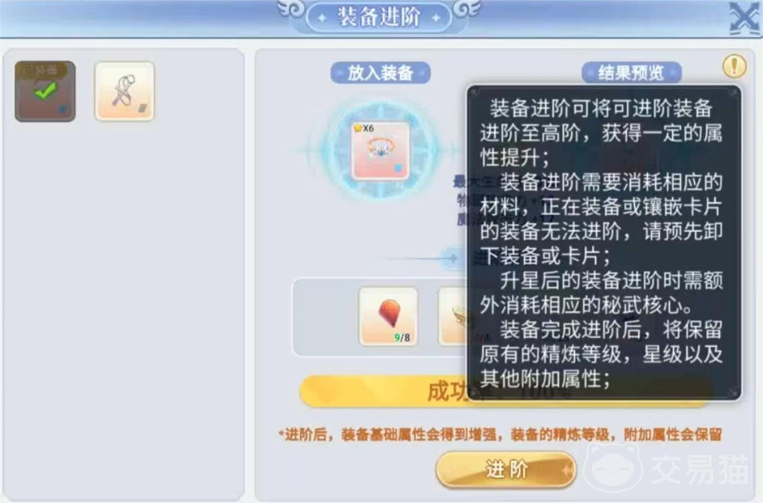 同时游戏中还会为大家提供进阶的预览功能,让大家能提前知道装备进阶所需要的材料和进阶以后的属性变化情况,方便玩家能够有个更好的判断,对于装备进阶也好提前去进行准备。
