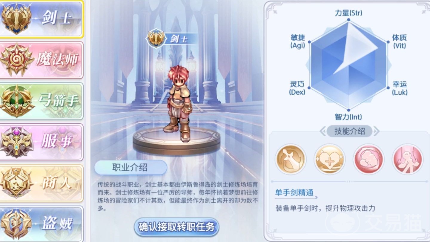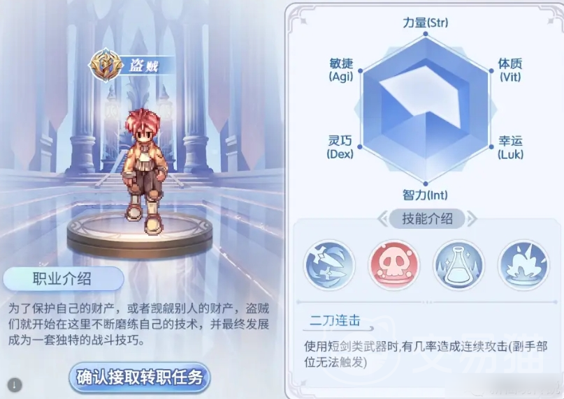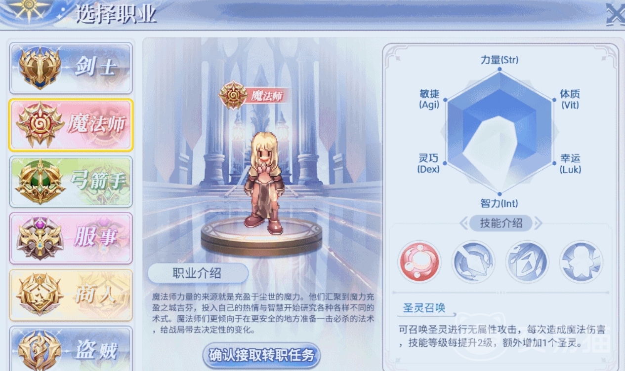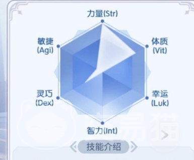 在各个职业的介绍中,可以看到每个职业对应的各项属性。属性分为了力量、体质、敏捷、幸运、智力、灵巧。每项属性都代表了不同方面的基础属性。