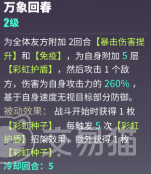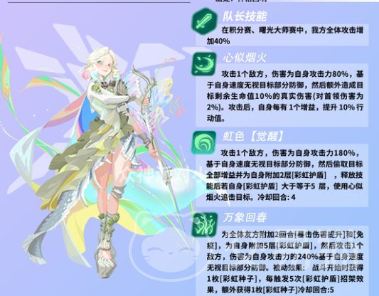 1技能在命中敌方角色后会造成额外的真实伤害,同时处于增益状态下的话,还可以提升自己的行动条,出手速度会更加快速,2技能给自己增加彩虹护盾,该状态下免疫百分之25的伤害以及部分眩晕控制。