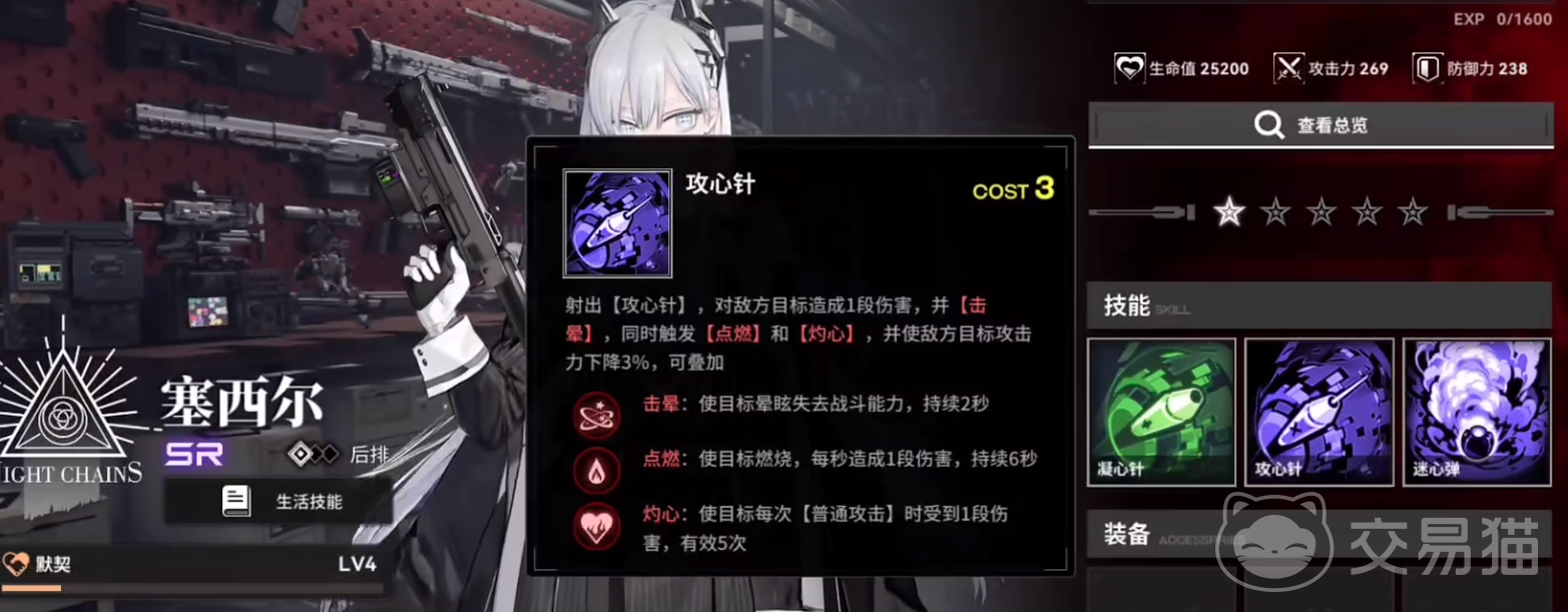 另外一个技能可以射出攻心针,对敌方目标造成伤害并击晕,触发点燃和灼心效果,降低对手的攻击力。击晕使敌人晕眩2秒,点燃造成每秒1段伤害。灼心使目标普通攻击时自伤,有效5次。