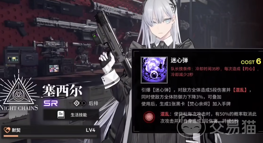 她有个主动技能,可以投掷一个炸弹,引爆后对敌方全体造成5段伤害并附加混乱效果,降低3%防御力,是个很特殊的技能。既能对敌人造成伤害,还可以削减防御。混乱还能让目标有一定概率取消攻击并自伤,持续数秒。