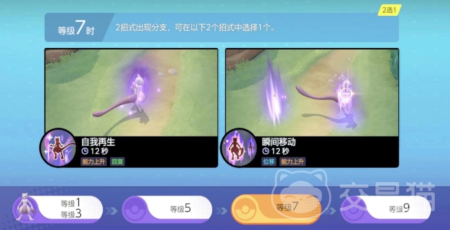 到达7级以后,超梦又一次面临技能分支的选择,这次的两个技能其效果有着很大区别,其中“自我再生”是一个带有回复和护盾的增益技,而瞬间移动虽然也有增益,但增幅不如前者,不过它却有着自我再生所没有的足足两段位移。