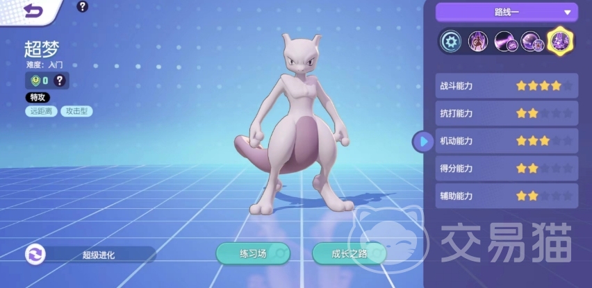 进行配招前,先需要了解一下超梦的属性和定位,它属于一个进攻型的角色,战斗能力较为突出,机动能力也还不错,不过其他的三项能力,诸如抗打,得分和辅助,这些都只能算作相对普通的水准,所以在进行技能配招的时候应该针对这些缺陷进行一定的弥补,同时也需要将本就突出的战斗能力进行进一步放大。