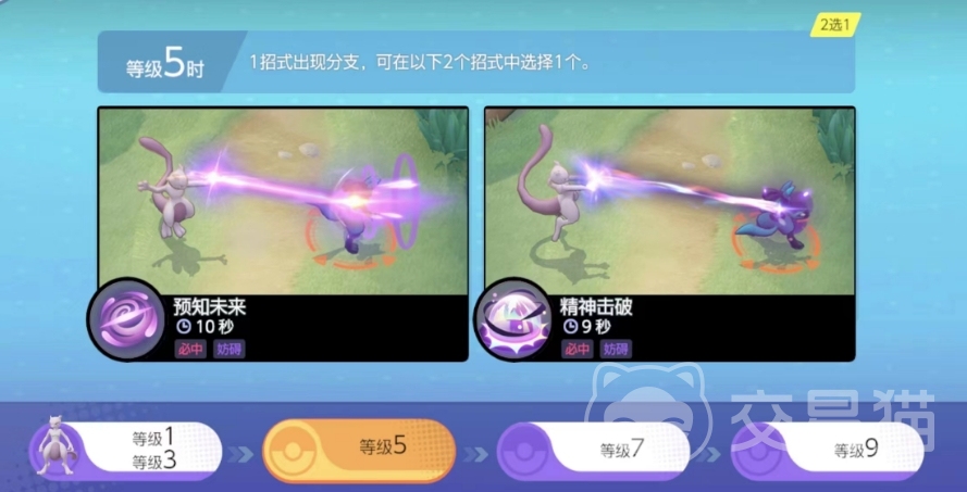 五级时超梦将面临一次技能的分支取舍,两者都有着必中的伤害和控制效果,不过更加推荐选择“精神击破”,首先它的CD会更短一些,其次,它的伤害会来的更快,击中敌方宝可梦后会直接造成伤害和减速效果,同时招式收尾时还会释放更为强大的念力波对目标以及目标周围的其他敌人都造成伤害和击飞。