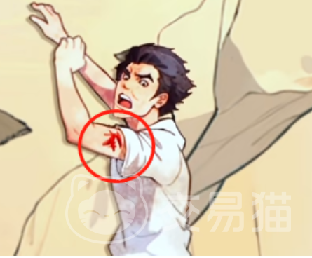 受伤:点开男子的T恤可以发现,该男子手臂已经开始流血,说明他已经在坠崖之前就已经受伤了,这歌疑点也是本关卡的危机点之一。