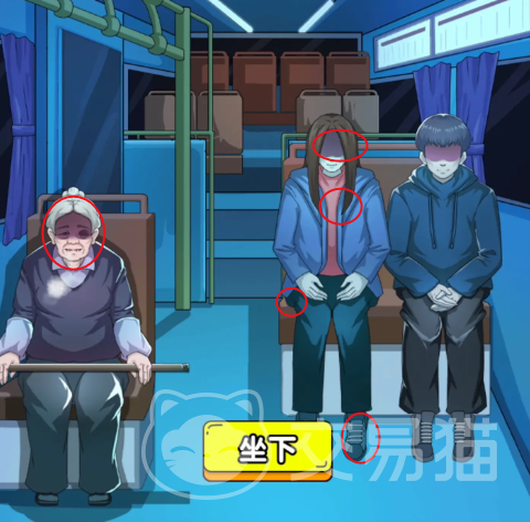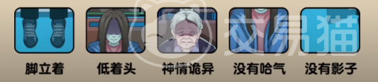 点击老奶奶后,选择坐下,这时候大家可以点击老奶奶的脸部【神情诡异】,这个时候就需要点击右侧坐着的两个NPC了,点击长发NPC的脸部【低着头】,然后点击胸膛【没有哈气】,紧接着点击脚部【脚立着】,最后就是衣角处【没有影子】;