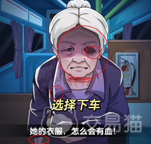 这个时候就可以切换到第二个场景了,这个场景会出现老奶奶的近身照片,首先需要点击老奶奶消失的右眼,然后点击【脖子裂痕】,点击【手干瘦】,再一次点击脸部得到【表情诡异】,最后选择衣领得到【衣服有血渍】,然后会出现弹窗,选择下车就可以了!