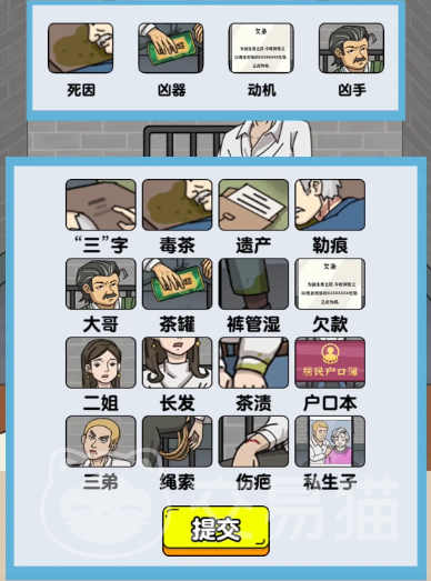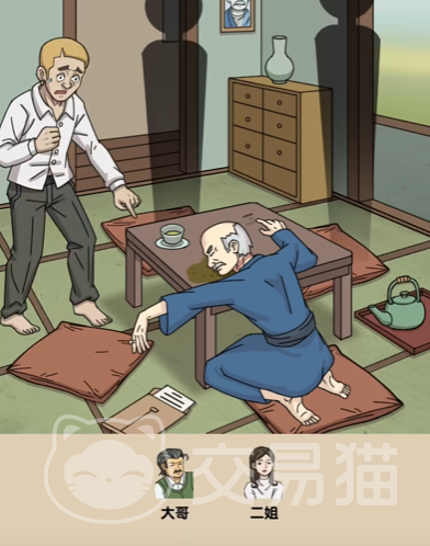 收集上面的线索需要玩家们进行排除,得到的结论是死因是因为大哥的欠款,使用茶罐中的茶进行下毒,然后把富豪给毒死掉!