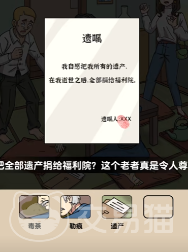 本次的关卡需要玩家们收集16个不同的线索,用这些线索找出真凶!首先来到第一个画面,画面出现的人物比较多!先从主角来看,在餐桌上趴着的就是富豪,点击嘴部流出来的【毒茶】,富豪脖子上的【勒痕】,同时在座子上,可以看到【三】字,是富豪写的,在地上还有【遗产书】!