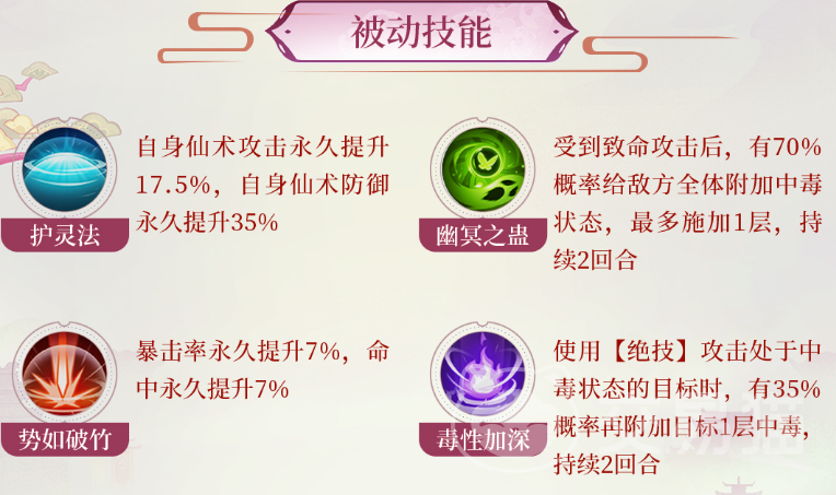 我们先得了解一下王蓬絮的技能特点,她主打一个施毒及控制流玩法,主动技能可以进行全体施毒还能够进行叠加,而另一个技能则是群体控制。而被动技能也基本上都是围绕施毒展开的,可以说技能针对性较强,十分适合我们在后期进行刷图时的输出补充类型选手,能有效地改善我们小队输出不足的情况。但也同样的原因会导致王蓬絮在前期表现非常一般,速推刷图的时候就有一点乏力,没等毒叠满就已经刷完了,直接浪费一个输出位。