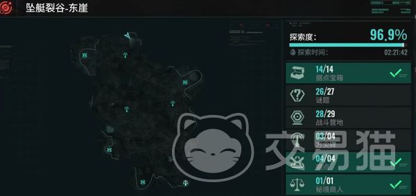 在东崖秘境中总共有14个据点宝箱,27个谜题,29个战地营地,4个方尖碑以及4个据点需要大家进行寻找,只有将它们全部找到,才能将该地图的探索度达到100%状态,其中宝箱里面有各种各样的物资,能大大提升玩家的强度,提升秘境探索度。