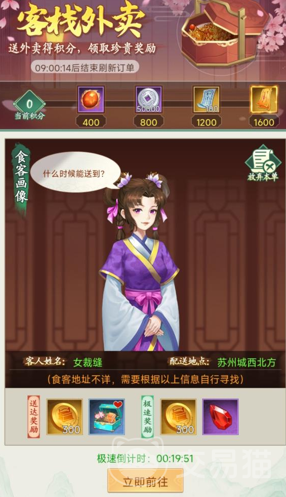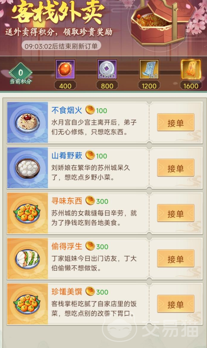 相信大家一定想不到,我们在仙剑世界中一样可以送外卖!毕竟作为一个轻功了得大侠来说,送送外卖补贴一下家用还是很合理的。想要开始活动的话先需要我们呢在客栈界面,找到掌柜的位置,点击外卖的红点,就可以看到不同的订单。每个订单都有不同的积分,一般来说,积分越高,难度越大。建议优先选择300积分的订单,因为它们的收益最高。每天接单的次数没有限制,所以可以多多接单,多多赚钱。